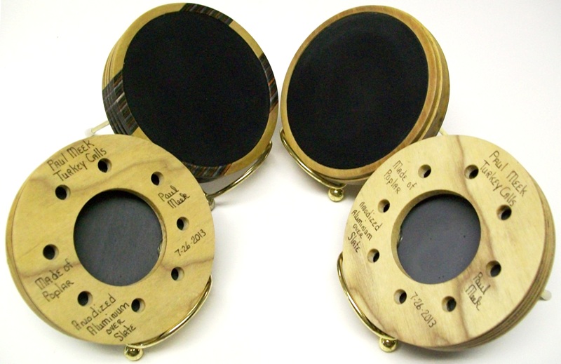 GREEN ALUMINUM calls are made with the striking surface made of green anodized aluminum and the back side is slate. a higher pitch call that is a real screamer if you get into it. It will get as loud as you want to hear. This is a two sided call that allows to play on both side for two different sounds. Price for call and striker is - $50.00 |